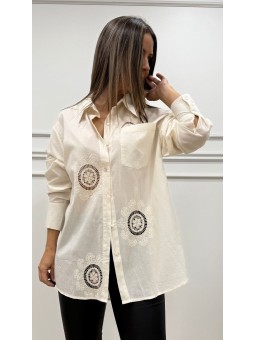143444 Camisa cuello solapa y manga larga acabada en puño. Cierre frontal con botones. Detalle de troquelados. Composición:100%algodón TALLA ÚNICA: Hombro:47cm Sisa:58cm Largo+-69cm