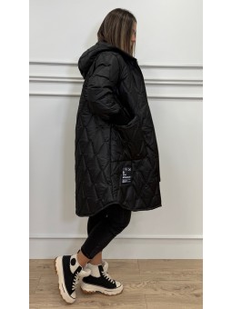 144110 Chaleco de cuello subido con capucha ajustable con cordones y manga sisa. Bolsillos delanteros con cremallera. Cierre frontal con cremallera. Composición:55%poliuretano 45%viscosa TALLAS: S: Hombro:36cm Sisa:48cm M: Hombro:38cm Sisa:50cm L: Hombro:40cm Sisa:52cm Largo+-87cm