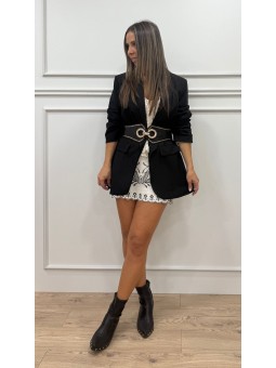 143822 Blazer de cuello solapa y escote pico. Manga larga con hombreras. Bolsillos con solapa en delantero. Forro interior de cuadros. Cierre frontal con botón. Composición:95%polyester 5%elastano TALLA ÚNICA: Hombro:39cm Sisa:53cm Largo+-72cm