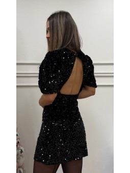 144468 Vestido de licra corto de manga sisa y copas con lentejuelas. Detalle de pequeño volante. Composición:85%polyester 15%elastano TallaSisa(cm)Cintura (cm)Largo (cm) TU 33 30 78