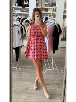 143256 Vestido corto de manga sisa. Nido de abeja en la parte superior. Composición:100%viscosa TALLA ÚNICA: Hombro:30cm Sisa:34cm Largo+-82cm