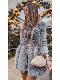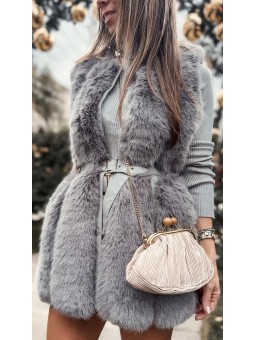 Artículo en preventa 144449 Chaleco de pelo combinado con polipiel. Manga sisa. Bolsillos delanteros. Detalle de cinturón. Cierre frontal con botones. Composición:80%acrylic 20%polyester TallaHombro (cm)Sisa (cm)Largo (cm) SM 36 46 76 LXL 38 48 78