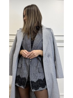 ARTÍCULO EN PREVENTA 144211 Falda corta de paño con bajo acabado en encaje. Composición:100%polyester TallaCintura (cm)Cadera (cm)Largo (cm) S 36 43 38 M 37 45 39 L 38 47 40