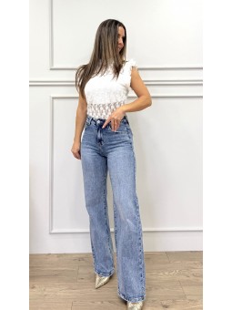 143792 Jeans de tiro medio y cinco bolsillos. Pierna ancha larga. Cierre frontal con cremallera y botón metálico. Detalle de lazada con puntilla en bolsillos. Composición:97%algodón 3%elastano TALLAS: 34: Cintura: 34cm Cadera:40cm 36:  Cintura: 35cm Cadera:42cm 38:  Cintura: 36cm Cadera:44cm 40:...