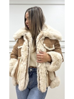 144119 Cazadora de cuello solapa con aplicación efecto pelo y manga larga acabada en puño con pelo extraíble. Bolsillos en delantero. Cierre frontal con cremallera. Composición:100%polyester TALLA ÚNICA: Hombro:50cm Sisa:60cm Largo+-60cm