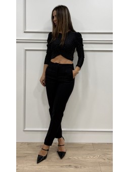 144405 Pantalón de tiro alto y cintura con trabillas. Bolsillos de vivo en delantero. Bajo acabado en línea evasé. Cierre frontal con cremallera y botón. Composición:45%PU 55% seda de la isla TallaCintura (cm)Cadera (cm)Larga (cm) 36 34 40 74 38 35 42 74 40 36 44 75 42 37 46 75...