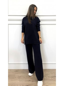 143904 Conjunto de punto formado por jersey de medio cuello y manga larga y pantalón con goma en la cintura y pata ancha. Composición:100%polyester TALLA ÚNICA: JERSEY: Hombro:57cm Sisa:58cm Largo+-70cm PANTALÓN: Cintura:34cm Cadera:49cm Largo pierna interior+-78cm