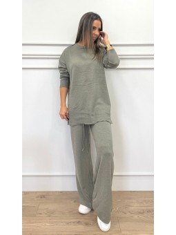 143902 Conjunto de punto formado por jersey de medio cuello y manga larga y pantalón con goma en la cintura y pata ancha. Composición:100%polyester TALLA ÚNICA: JERSEY: Hombro:57cm Sisa:58cm Largo+-70cm PANTALÓN: Cintura:34cm Cadera:49cm Largo pierna interior+-78cm