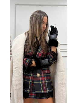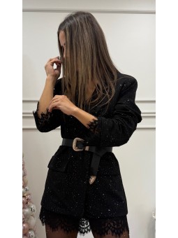 144502 Blazer con cuello solapa y manga larga con abertura y botones. Bolsillos con solapa en delantero. Forro interior. Bajo con aplicación de encaje a tono. Composición:90%polyester 10%viscosa TallaHombro (cm)Sisa (cm)Largo (cm) TU 42 53 75