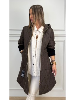 144110 Chaleco de cuello subido con capucha ajustable con cordones y manga sisa. Bolsillos delanteros con cremallera. Cierre frontal con cremallera. Composición:55%poliuretano 45%viscosa TALLAS: S: Hombro:36cm Sisa:48cm M: Hombro:38cm Sisa:50cm L: Hombro:40cm Sisa:52cm Largo+-87cm