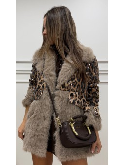 144378 Cazadora de cuello solapa con pelo y manga larga. Tejido combinado con lentejuelas. Cierre frontal con botones. Composición:100%polyester TallaHombro(cm)Sisa (cm)Largo (cm) TU 44 59 70