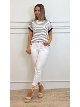 143430 Camiseta manga corta, escote V con encaje delante y en la vertical de la parte de atrás Composición: 95%algodón 5% elastano Talla Única: Hombros: 37cm Sisa: 39cm Largo: +-54cm