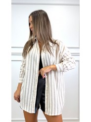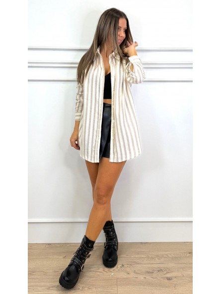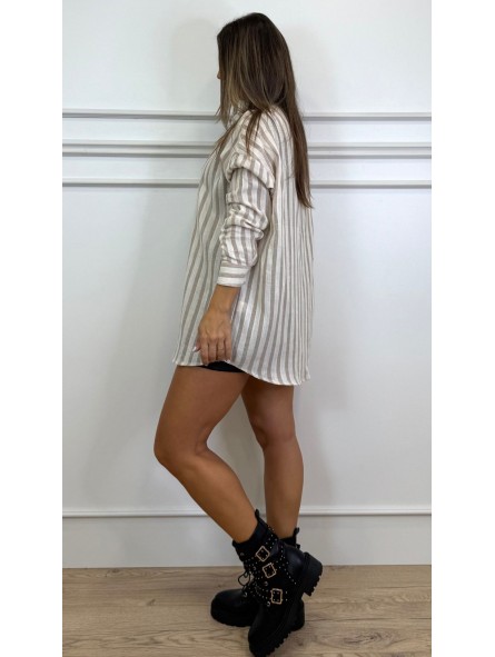 Camisa de rayas y cuello solapa. Manga larga. Cierre frontal con botones.