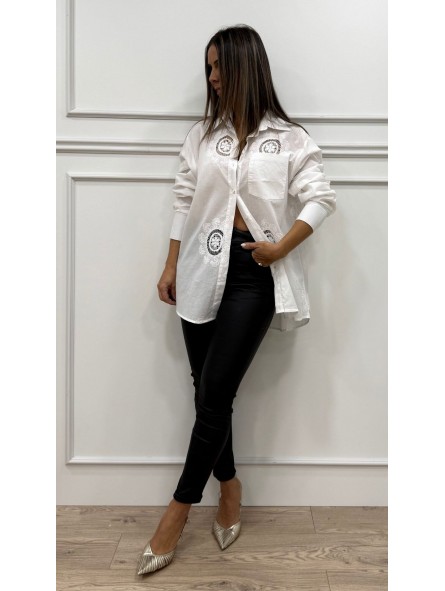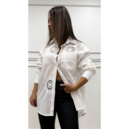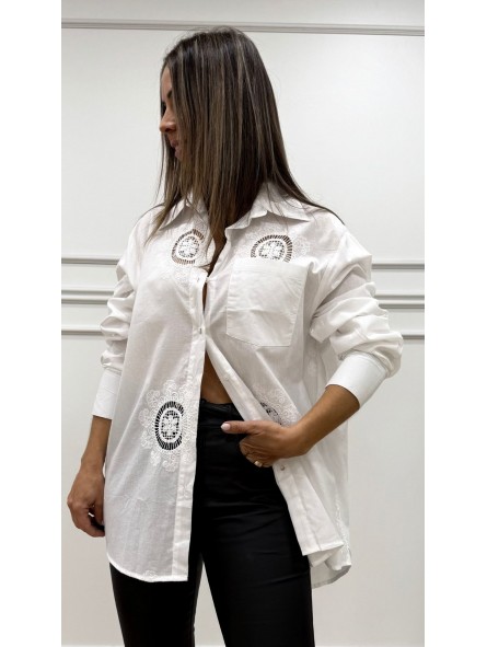 Camisa cuello solapa y manga larga acabada en puño. Cierre frontal con botones. Detalle de troquelados.