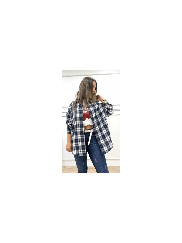 Camisa cuello solapa y manga larga acabada en puño con botón. Detalle de brillos en manga y costados. Cierre frontal de botonadura.