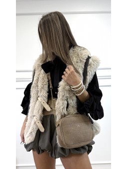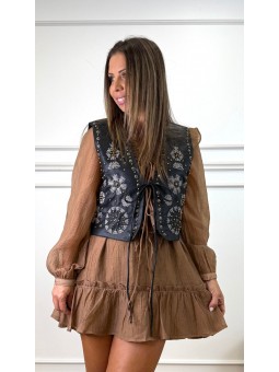 Chaleco denim combinado con pelo. Bolsillos delanteros de vivo. Cierre frontal con alamares.