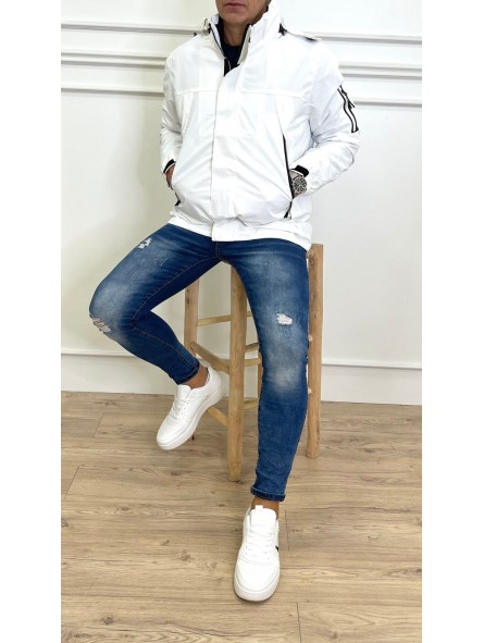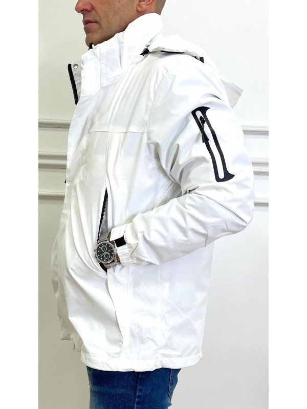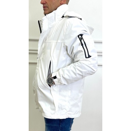Cazadora regular fit. Cuello subido con capucha desplegable en su interior. Manga larga acabada en puño con elástico. Forro interior con estructura de red. Bolsillos de vivo en cadera. Cierre frontal con cremallera oculta por solapa con botones a presión.