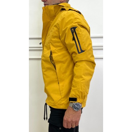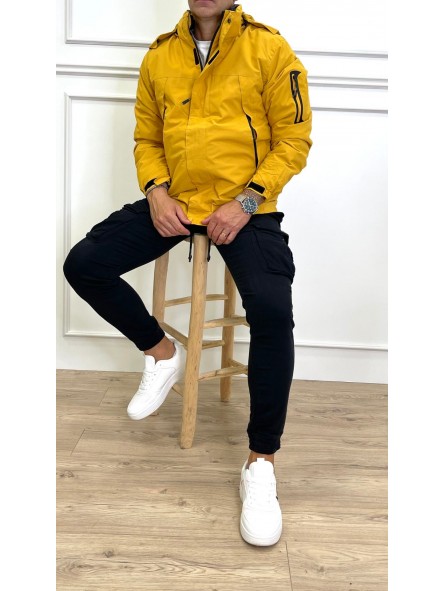 Cazadora regular fit. Cuello subido con capucha desplegable en su interior. Manga larga acabada en puño con elástico. Forro interior con estructura de red. Bolsillos de vivo en cadera. Cierre frontal con cremallera oculta por solapa con botones a presión.