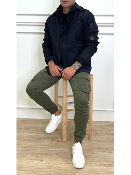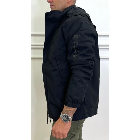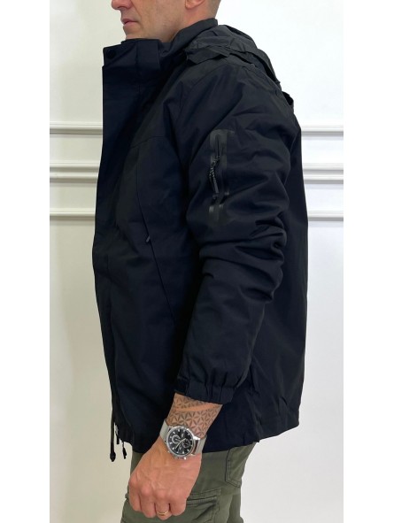 Cazadora regular fit. Cuello subido con capucha desplegable en su interior. Manga larga acabada en puño con elástico. Forro interior con estructura de red. Bolsillos de vivo en cadera. Cierre frontal con cremallera oculta por solapa con botones a presión.