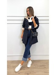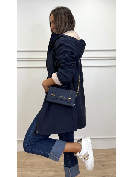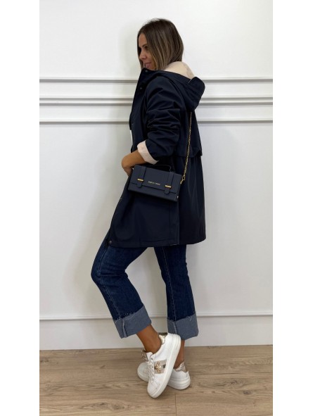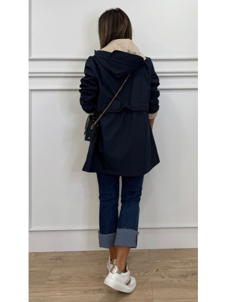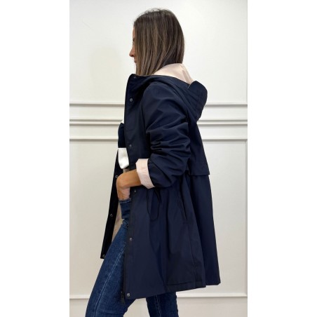 Chubasquero reversible largo, con capucha ajustable con cordones elásticos y stoppers. Manga larga. Bolsillos en vivo. Cintura ajustable. Cierre frontal con cremallera y botones a presión.