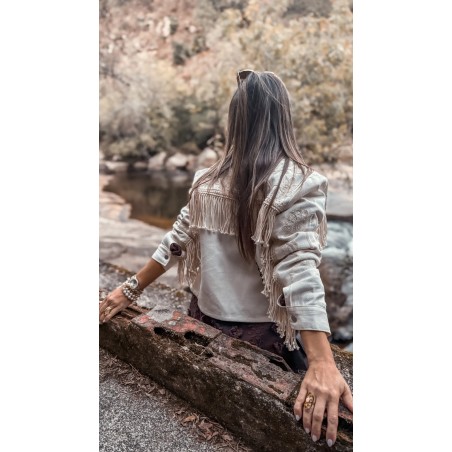 Chaqueta con cuello cura. Bordados en hombro ,pecho y manga. Cierre frontal con cremallera .