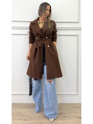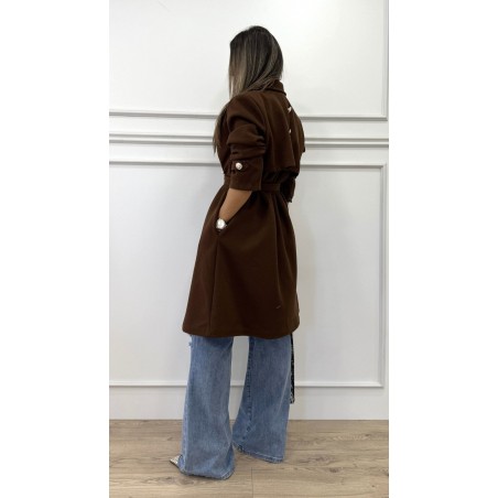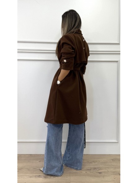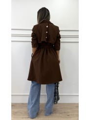 Abrigo de cuello solapa y manga larga acabada con trabilla y botón. Cierre frontal cruzado con botones. Espalda con botones dorados