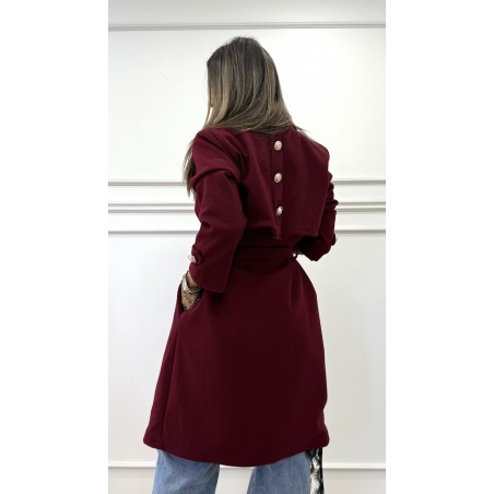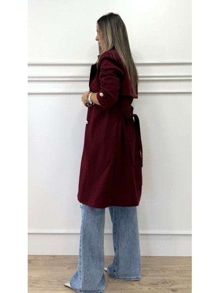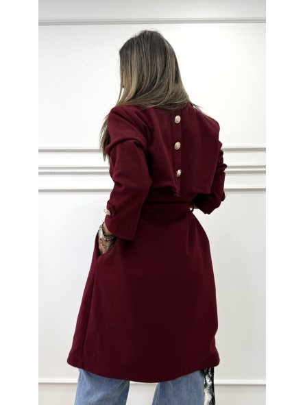 Abrigo de cuello solapa y manga larga acabada con trabilla y botón. Cierre frontal cruzado con botones. Espalda con botones dorados