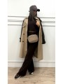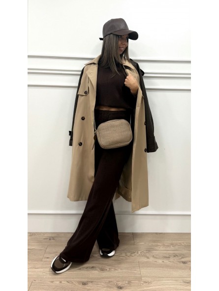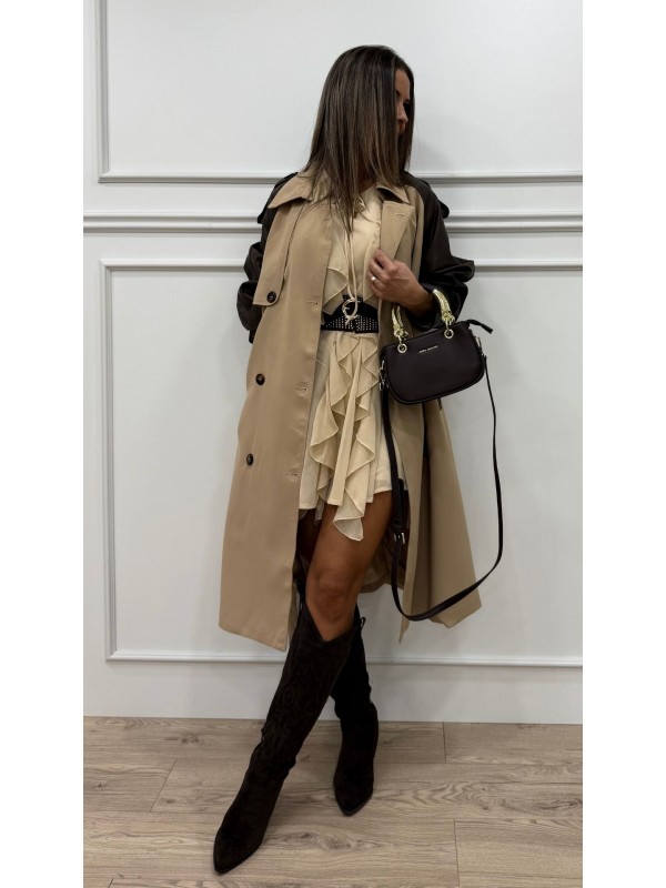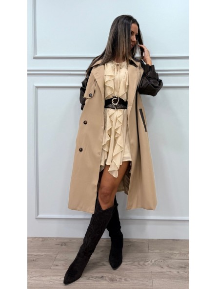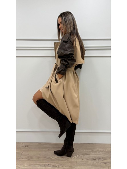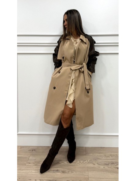 Trench de cuello solapa y manga larga de polipeil. Detalle de acabados con trabillas. Bolsillos delanteros de vivo. Bajo con abertura en espalda. Cierre frontal cruzado con botones y cinturón del mismo tejido.
