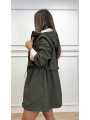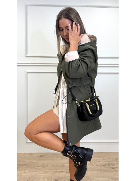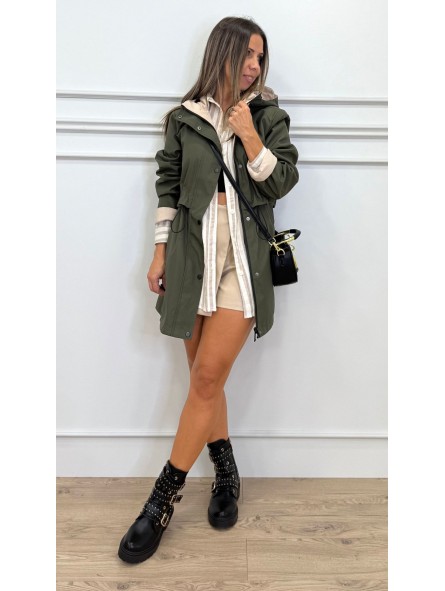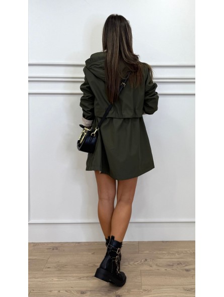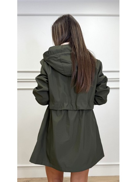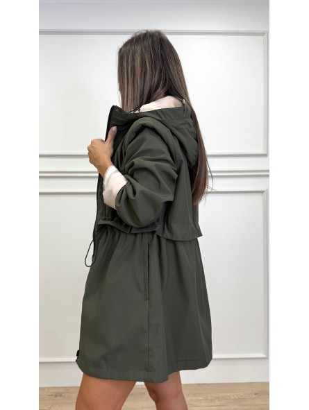 Chubasquero reversible largo, con capucha ajustable con cordones elásticos y stoppers. Manga larga. Bolsillos en vivo. Cintura ajustable. Cierre frontal con cremallera y botones a presión.