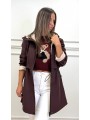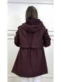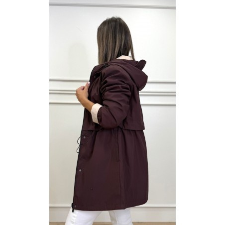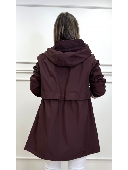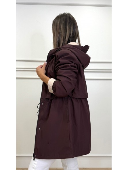 Chubasquero reversible largo, con capucha ajustable con cordones elásticos y stoppers. Manga larga. Bolsillos en vivo. Cintura ajustable. Cierre frontal con cremallera y botones a presión.