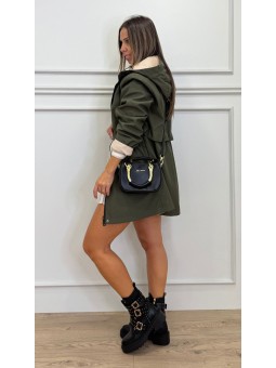 143455 Cazadora de cuello solapa y manga larga con trabillas en hombro. Bolsillos delanteros con botón dorado. Cinturón en mismo material con hebilla metálica. Cierre frontal con botones de corchete. Composición:68.8%polyuretano 28.3%polyester 1.6%viscosa 1.3%algodón TALLAS: S: Hombro:38cm...