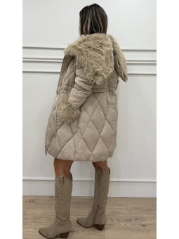 143997 Plumífero con cuello subido con forro interior y capucha con pelo. Manga larga con puños terminados en pelo desmontable. Cordón ajustable en cintura. Bolsillos e vivo. Composición:100%polyester TALLAS: S: Hombro:41 Sisa:50cm M: Hombro:42cm Sisa:52cm L: Hombro:43cm Sisa:54cm Largo+-89cm