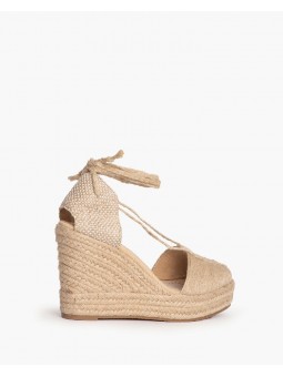 142992 Plataforma tipo valenciana, con cuña en yute. Corte trenzado. Cierre mediante tiras trenzadas y anudadas al tobillo.Altura del tacón 10 cm.Altura de la plataforma 3 cm.