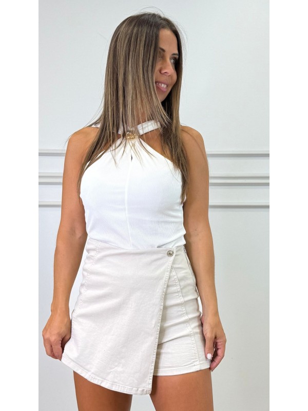 Falda pantalón de tiro alto con bolsillos de plastrón en espalda. Cierre frontal cruzado con cremallera oculta.