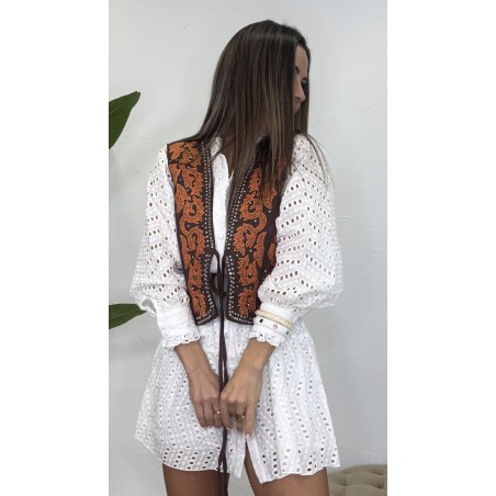 Chaleco de escote pico y manga sisa. Detalle de bordados con aplicación de abalorios. Cierre frontal con lazadas.