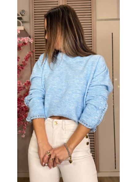 Jersey de punto, cuello redondo con puntilla y manga larga acabada en botones con puntilla. Bajo acabado en rib.