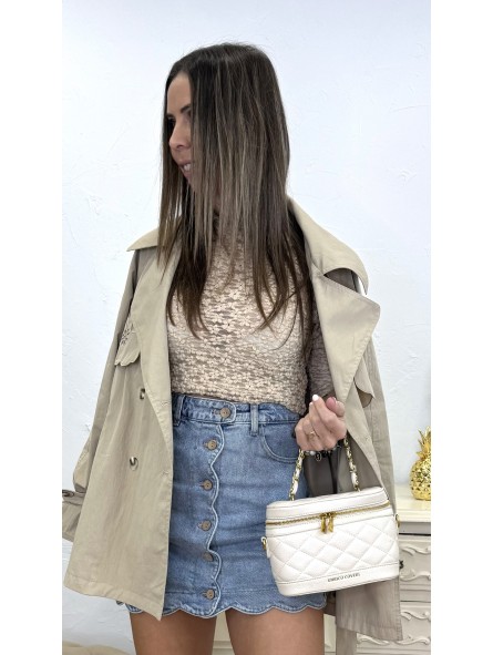 Chaqueta fluida de cuello alto y manga larga con trabillas. Bolsillos en delantero. Cinturón en mismo tejido. Cierre frontal con botones. Volantes en hombro.