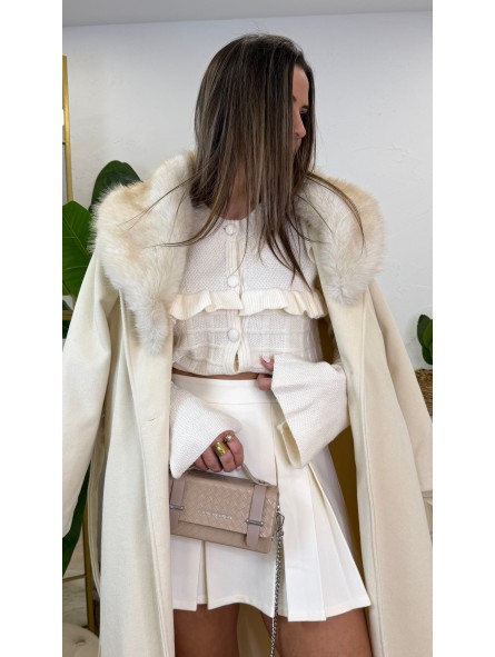 Falda pantalón de tiro medio con pliegues delanteros. Cierre lateral con cremallera oculta en costura.
