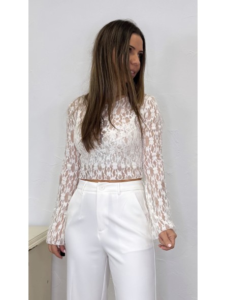 Camiseta tipo encaje. Cuello redondo y manga larga. Acabados en ondas.