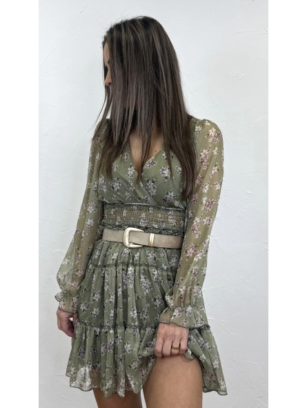 Vestido de manga larga y escote pico. Goma en la cintura. Bajo acabado con volantes.