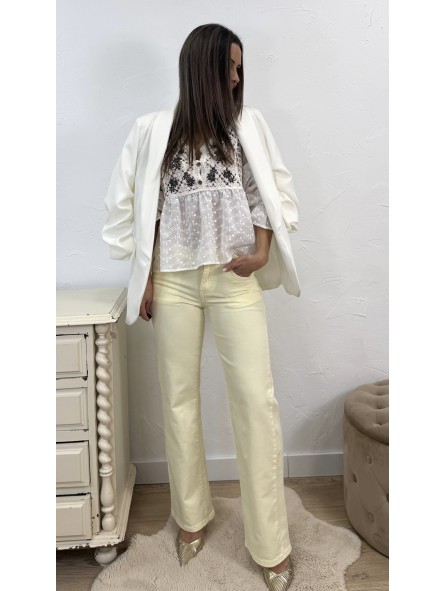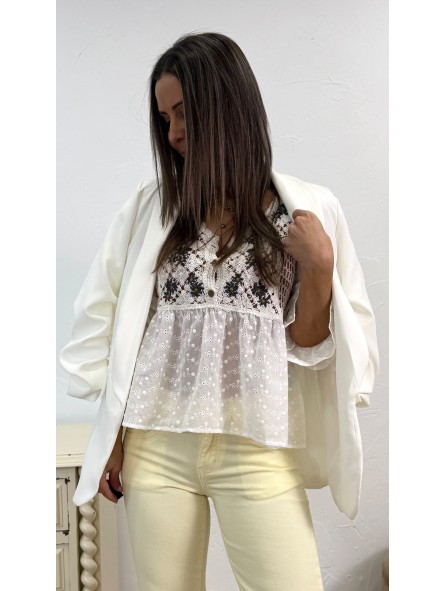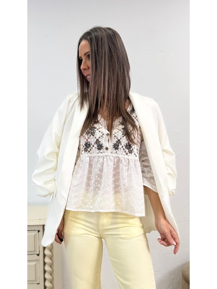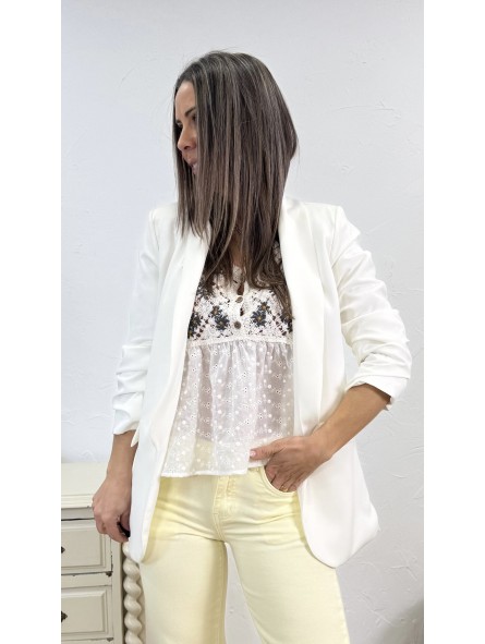Blazer de cuello solapa y manga larga con hombreras. Bolsillos en falso delanteros con solapa.