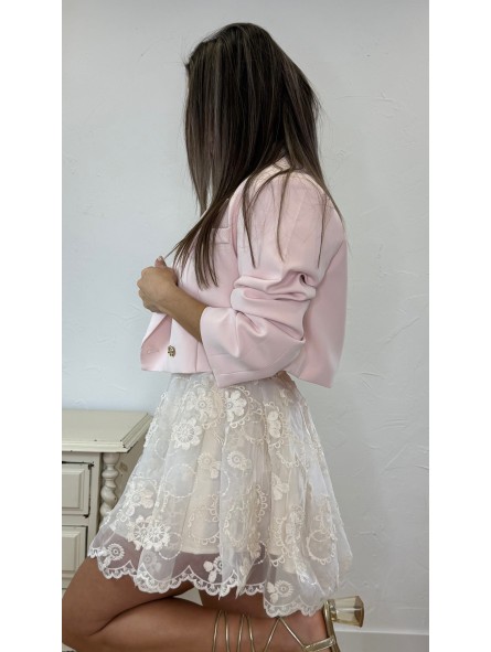 Blazer corta con hombreras y cuello solapa. Cierre cruzado con botones.