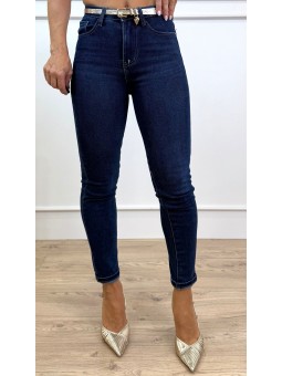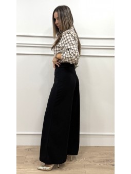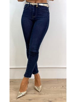 Jeans de tiro medio y cinco bolsillos. Pierna ancha larga. Cierre frontal con cremallera y botón metálico. Detalle de lazada con puntilla en bolsillos.
