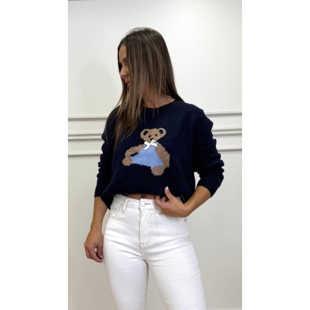 Jersey amplio de punto liso con cuello redondo y manga larga. Acabados en rib. Estampado frontal.