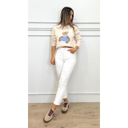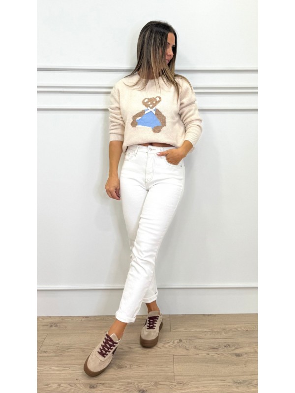 Jersey amplio de punto liso con cuello redondo y manga larga. Acabados en rib. Estampado frontal.