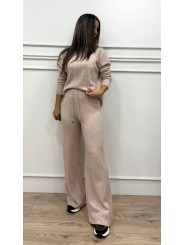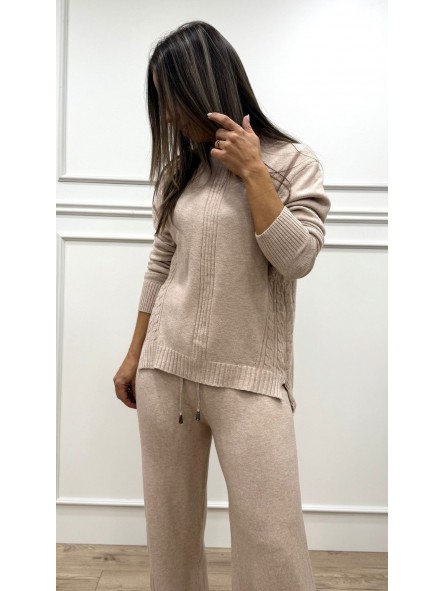 Conjunto de punto formado por jersey de medio cuello y manga larga y pantalón con goma en la cintura y pata ancha.