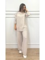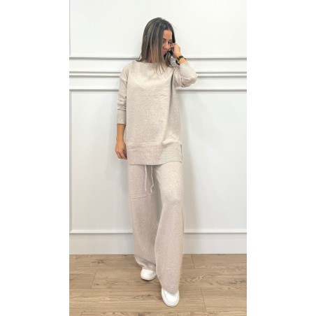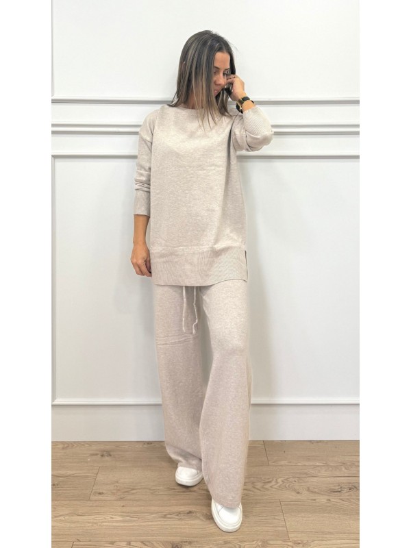 Conjunto de punto formado por jersey de medio cuello y manga larga y pantalón con goma en la cintura y pata ancha.