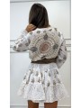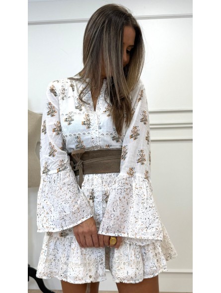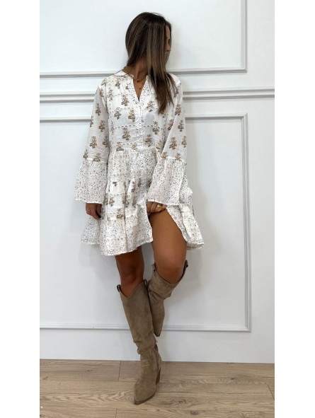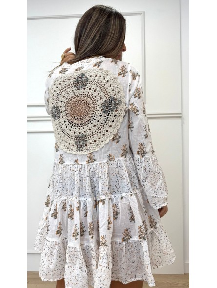 Campera bordada beige 44,95 € Beige 36 37 38 39 40 41 Añadir al carrito 143532 Vestido boho corto de manga larga y cuello mao. Cierre frontal con botones. Bajo acabado en volantes. Composición:100%algodón TALLA ÚNICA: Hombro:40cm Sisa:50cm Largo+-85cm