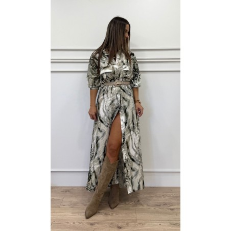 Vestido estampado largo, manga larga ajustable, cuello camisa, bolsillo delanteros cuadrado con solapa, vestido de la parte de atrás más larga efecto cola